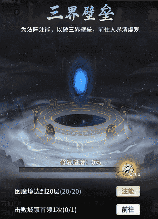 当你修为达到返虚/破虚中期后,,可在城镇寻得芸丫并激活神秘法阵,,,通过收集材料、、、、击败首领等方式为法阵注能,,借以打破三界壁垒,,,,开启支线剧情“清虚旧梦”