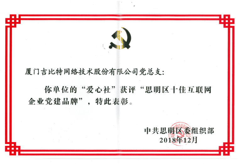 经初审评选、、、、网络评选和专家评审等环节,,"厦门918.com网络技术股份有限公司党总支-爱心社" 从全区28个参评党建品牌中脱颖而出,,,,获评"思明区十佳互联网企业党建品牌"。。。。